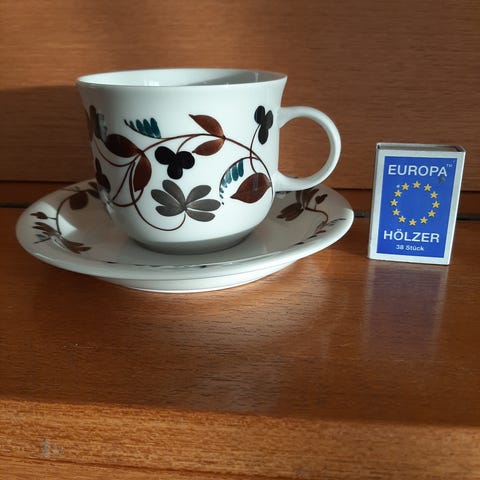 Kupit olivat tuotannossa 1978-1981. Virheettömiä astioita. Teekupin korkeus on 7,5 cm halkaisija 9 cm. Aluslautasen halkaisija on 15,7 cm. Näitä minulla on enemmänkin. Hinta: kuppi+lautanen 28 €. Nouto tai postitus.