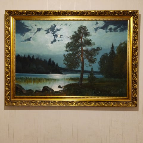 Tunnelmallinen kuutamotaulu. Koko kehyksineen n.77x62cm ja ilman kehyksiä n.65x51cm. Signeeraus R.Vuolas tai joku semmonen.
