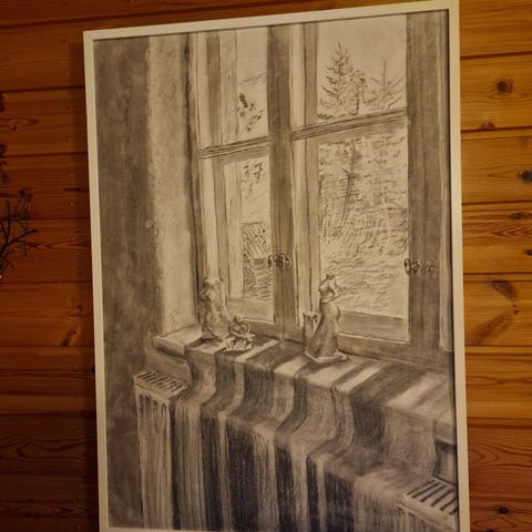 Myydään harmaapohjainen kirjaintaulu. Taulussa on harmaat puujäljitelmäkehykset.