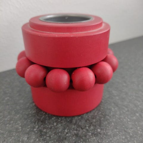 Aarikan kulho, jossa punainen helminauha koristeena. Leveys 11 cm ja korkeus 9 cm. Ehkä kerran käytetty, kuin uusi.