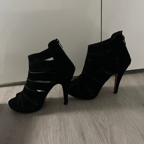 Hyväkuntoiset, vähällä käytöllä olleet, kiiltonahkaiset korkokengät. Kuvassa näkyvä kärjissä on heijastumaa, ei kulumaa. Pohjissa toki käytön jälkiä. Nouto Vuosaaresta tai postitus.