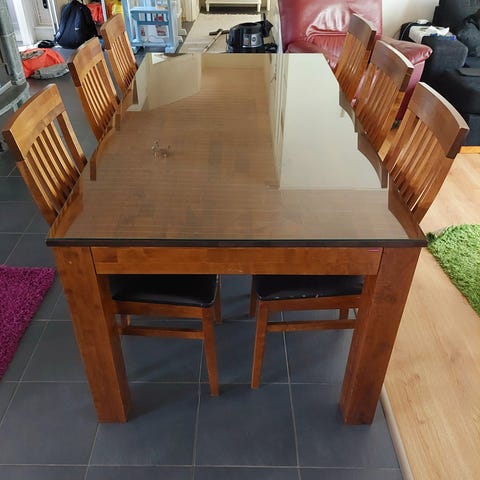 Pohjanmaan Kalusteen valkoinen ruokaryhmä, tuolit valkoisella nahalla. Pöytä lasikannella.