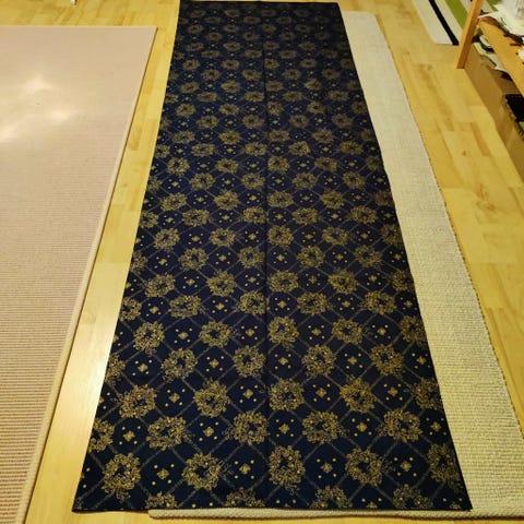 Puuvilla,uusi liina/ kangas valkoisella pohjalla tiheästi lehtikuvioita.Luonnossa sävy tummempi 140 x 376 cm 18+ postitus 6