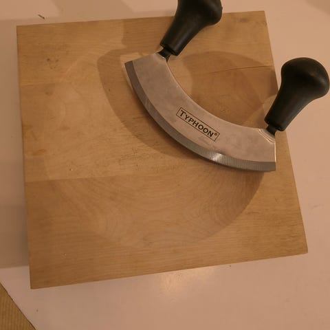 Muutaman kerran käytetty yrttileikkuri (ruostumaton teräs) + puualusta