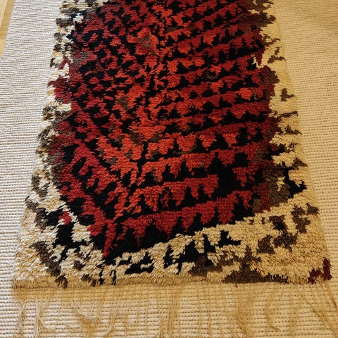 Hyväkuntoinen Kirsti Ilvessalon suunnittelema ryijy.