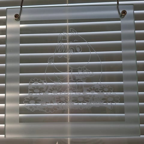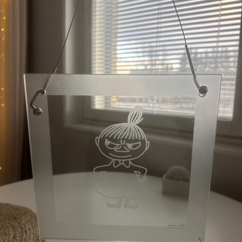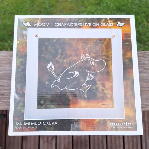 Kuvanmukainen, hyvässä iskussa oleva MUUMI lasitaulu.