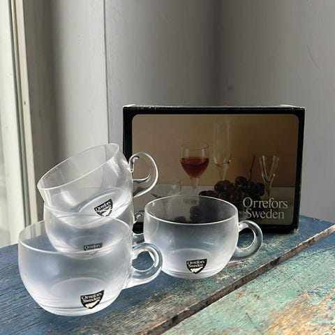 Orreforsin ruotsalaiset kauniit lasit, joissa irroitettavat koriste puuhelmipannat. Lasin korkeus 16 cm, suuaukko 9,5 cm. Moitteettomassa kunnossa, hyvin vähäisellä käytöllä olleet.