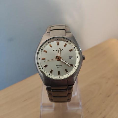 Kuvassa oleva vain pari krt juhlatilanteissa käytetty Leijona Titanium ( 5088-621 ) vesitiivis 10 ATM rannekello. Paketin pohjalla muutama jatkopala rannekeeseen