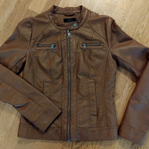Myydään pieneksi jäänyt keinonahkatakki. Takin pinta halkeillut sisä ja ulkopuolelta kauluksen kohtaa.