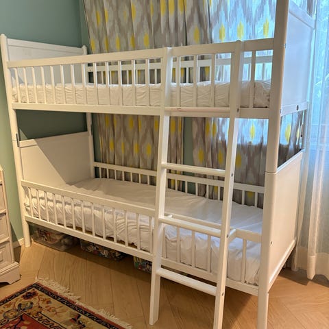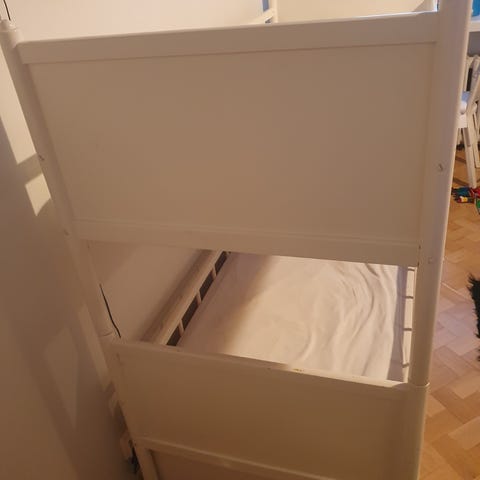 Niemen tehtaiden 50-luvun tukevat lastensängyt jotka saa kasattua päällekkäin kerrossängyksi tai erikseen. Olleet todella hyvät ja tukevat ja palvelleet tähän saakka kun toinen lapsista on 10v eikä enää mahdu sänkyyn. Tarvitsee maalipinnan kunnostusta yhdeltä reunalta, se kun on kulunut, muutoin ei moitteita.