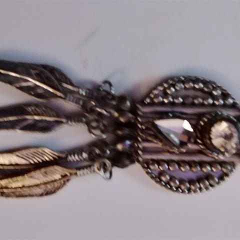 Kaulakoru on leveä mallinen ketju tummilla helmillä ja kristalli lasi helmillä