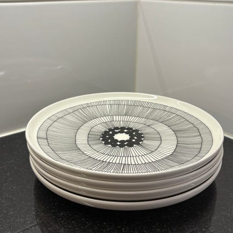 Myydään 10kpl marimekko oiva siirtolapuutarha ruokalautasia. Kahdessa lautasessa säröä (kuvat). Muuten hyvässä kunnossa.
