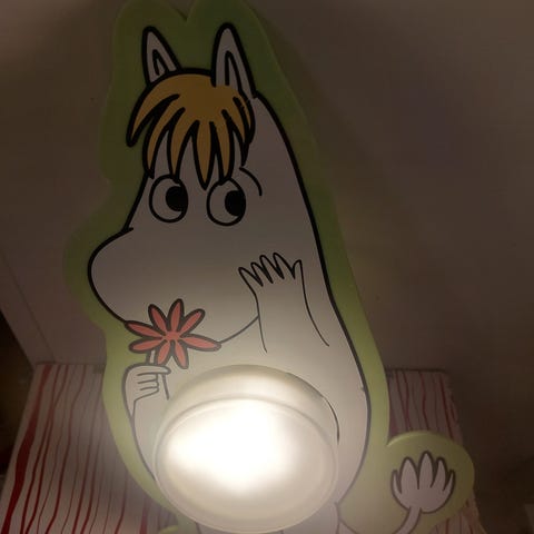 Vanha Muumi characters / BULLS pöytävalaisin. Valaisinkupu/ hattu on jonkin sortin kangasta, mikä jäykistetty joko muovilla tai jäykällä pahvilla.