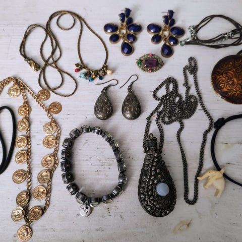 Puu ja metalli korut yhteensä.Ostettu 90-luvulla.