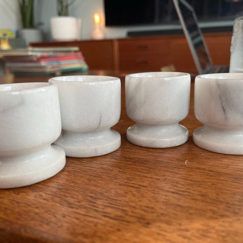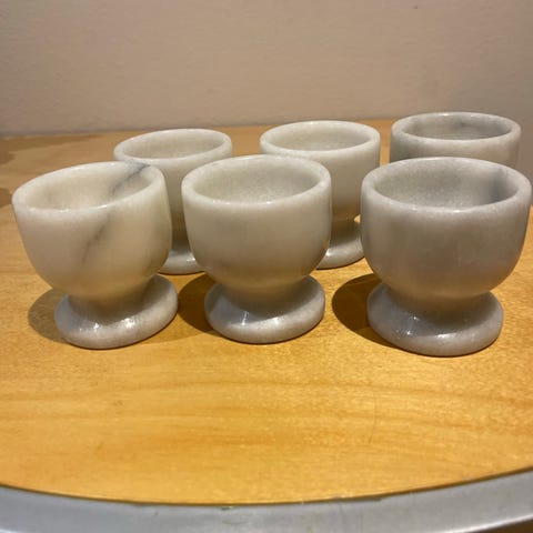 Myydään käyttämättömät marmoriset munakupit 6kpl, korkeus n. 7,5cm ja halkaisija n. 4,5cm.