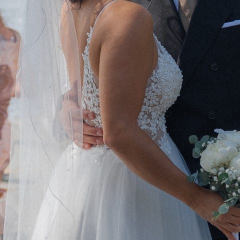 Kaunis Zazabellan a-linjainen Dazzling häämekko kokoa 40. Mekossa on runsas helma, nyöritys takana.