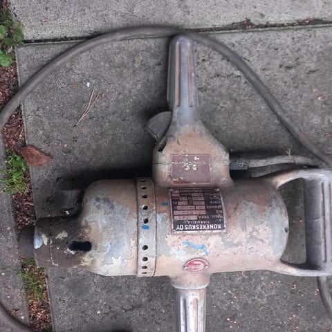 Vanha, toimiva, järeä porakone, 3-16mm Mikro oy:n pikaistukalla. Merkkiä en tiedä varmasti, enkä kuoresta löytänyt, mutta vaikuttaisi kotimaiselta Erka merkkiseltä. Täysalumiinirunkoinen.