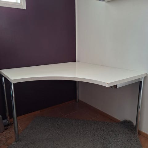Yhtä kulmaa lukuunottamatta (teipattu pinnoite) erittäin siisti atk-kulmapöytä. Kannen oikean puolen kiinnitystappeja ei ole liimattu, vasemman puolen on. Tarvinnee 2 kantajaa, vanhana romuna en voi osallistua.