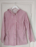 Puuvilla 100%, ohuet, punaiset ja valkoiset raidat, painonappiniinnitys. Takin takana kuminauha, jolla saadaan istuvuutta. Edessä vetoketjulliset taskut.