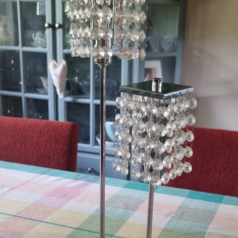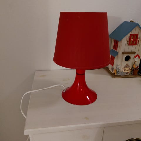 Pöytälamppu jossa punainen varjostin ja musta muotoiltu jalka. Valaisimeen menee E14 kantainen kynttilälamppu.
