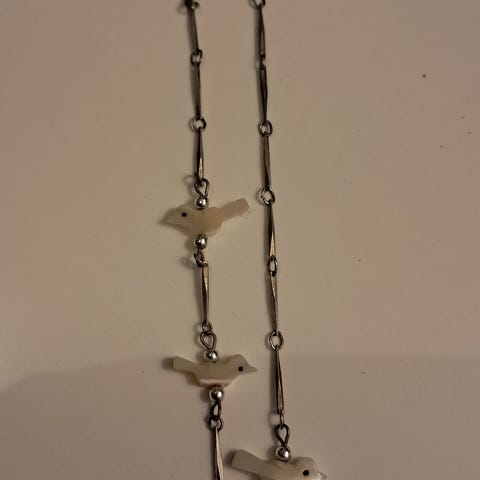 Kaunis lintuaiheinen vintageriipus noin 34 x 20 mm. Cordell kaulaketju noin 45 cm. Koruissa ei ole leimoja, joten ne ovat luultavasti korumetallia. Riipuksen reunassa siivenkärjessä (kuvassa oikealla) on halkeama, riipuksessa ja ketjussa patinaa.