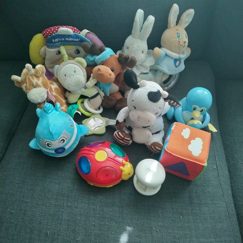 Myydään vauvan/taaperon lelusetti. Sis. Helistimiä sekä turvakaukaloon kiinnitettävän pöllölelun.