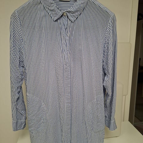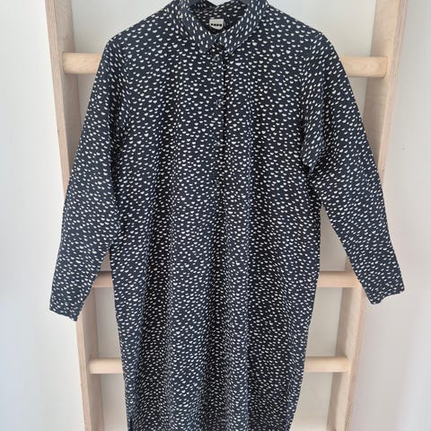 Suomalaisen Papun laskostettu paita. Värit rosa ja harmaa. Malli Pleated ja kuvio Woods. Vilpoista ja kauniisti laskeutuvaa lyoselia. Vastaa kokoa L-XL. Selässä langannousuja, joista kuva. Käytetty vaate.