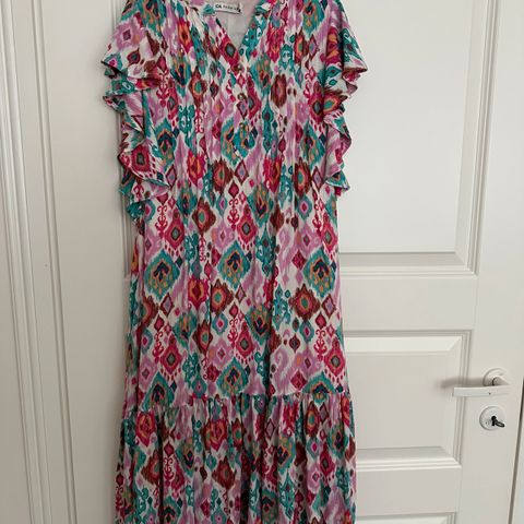 Kaunis juhlamekko, jossa tummansinisellä pohjalla värikkäitä kukkia. Päällinen läpikuultavaa kangasta ja vuori kiiltävää, hieman joustavaa materiaalia, molemmat 100% polyesteriä. Vähäisellä käytöllä ollut, siisti kunto.