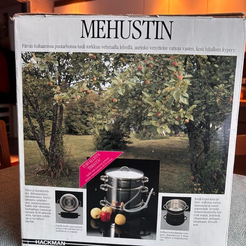 Siisti 9 litran marjatilavuudella varustettu mehustin ruostumattomasta teräksestä (ei induktiolevylle). Ulkohalkaisija n. 30 cm, alaosan mehutilavuus n. 4 litraa, "levypohjan" halkaisija 22 cm.