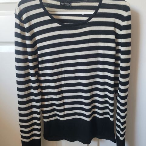 Marimekon lyhytmallinen, merinovillainen villajakku, jossa hihan pituus ei ole täyspitkä (katso kuvat). Väri tumma sininen, kuvissa muuttuu jonkin verran. Tummissa kuvissa oikeampi väri. Tuotelapussa maininta extra laadukasta merinovillaa. Kokomerkintä on L, mutta mielestäni lähinnä M, kuvan mallihenkilö on noin kokoa M. Tosin villa joustaa ja menee varmaan myös L kokoiselle. Lämmittää hyvin viilenevillä säillä. Nouto tai postitus.