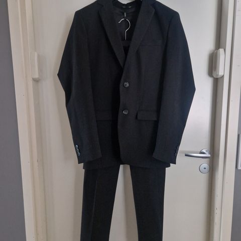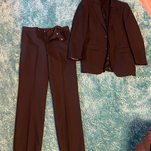 Myydään musta puvuntakki ja housut, koko 44. Puku sopii hyvin nuorelle tai nuorelle aikuiselle.