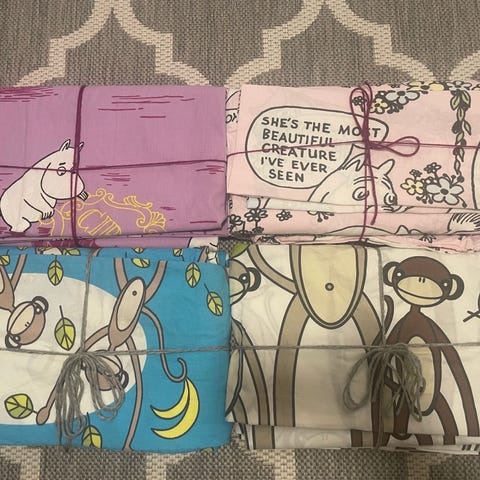 Finlaysonin muumikuosinen lasten pussilakana ja tyynyliina. Pussilakanan mitat n. 118x78 cm. Tyynyliinan mitat 57x36 cm.