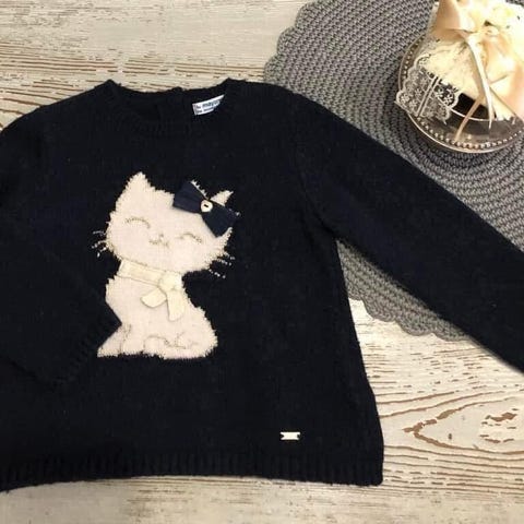 Käsin neulottu farkunsininen paita, koko noin 86-92cm. Niskassa pieni halkio ja 2 nepparia pukemista helpottamaan. Edessä "kengurutasku". Malli Phildar, lanka Phil Ecolo (ei tunnu karhealta eikä kutita), väri Denim.