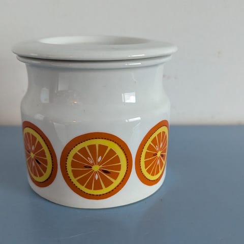 Hyväkuntoinen Arabian Pomona appelsiini purnukka -60 luvulta. Suunnittelija Raija Vosikkinen. Purnukka on ehjä ja ollut kauan poissa käytöstä. Pieni purnukka on mitoiltaan:korkeus 6 cm ja halkaisija 9,5 cm ulkoreunoista mitattuna. Arabian kruunuleima pohjassa.