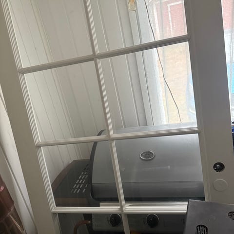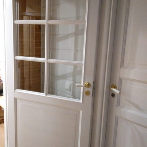 Hyväkuntoinen valkoinen vasenkätinen yksiruutuinen väliovi karmeineen.