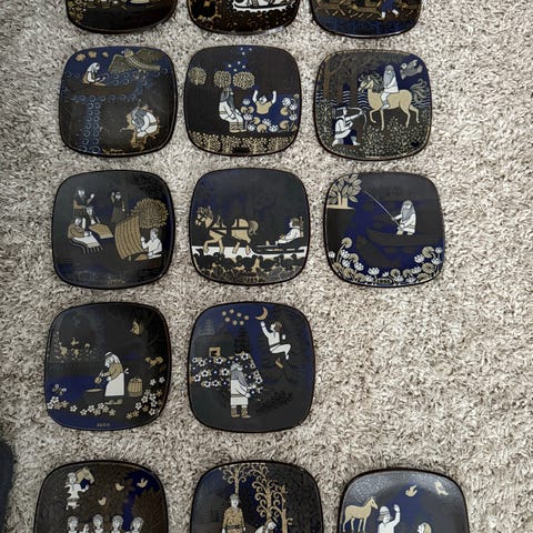 Lautaset hyvässä kunnossa ja ehjät. Myydään vain settinä, ei erikseen. Jokaiseen lautaseen aitoustodistus.