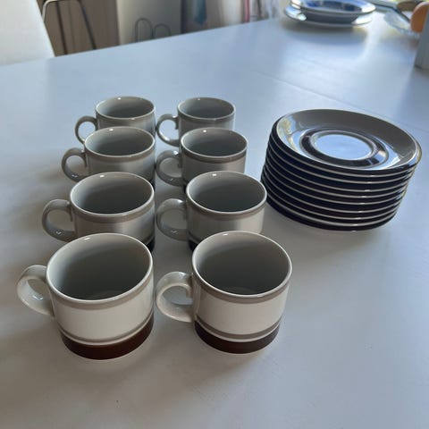 Vintage Arabia Kahvikupit, kahvilautaset, leipälautaset, kuppi halkaisija 6.5x6 cm, kahvilautanen halkaisija 14 cm, leipälautanen 17 cm, Raija Uosikkinen 1971-86 ei ole ollut käytössä
