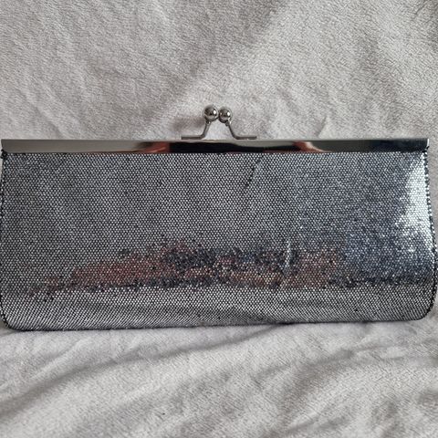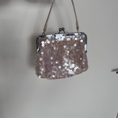 Myydään viininpunainen nätti paljettilaukku metalliolkaimella.