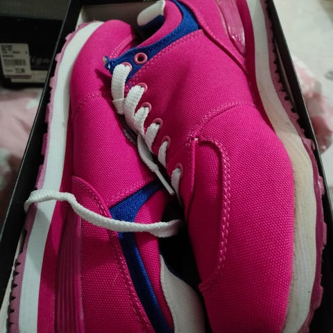 Pinta tekstiiliä, sivussa ilmavuutta tuovat aukot. Aukoissa olevat kuminauha venykkeet tuovat joustoa ja tilavuutta. Irrotettava sisäpohja, jossa kantapään ja päkiän kohdat pehmustettu.