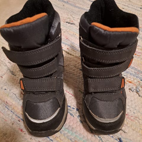 Pitkävartiset tarralla kiinnitettävät talvikengät. Kengän kärjissä kulumaa ja toisen kengän yksi tarraosista repsottaa.