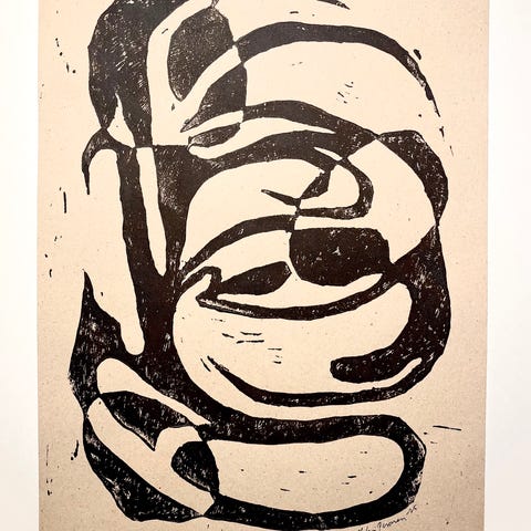 Kehystämätön linografiikan vedos, peura tai kauris jonka sarvet yhtyvät puihin ja etualalla kukka, niitty, tausta vaaleanpunainen liukuväri, teos mustalle paperille painettu linolaatalla,