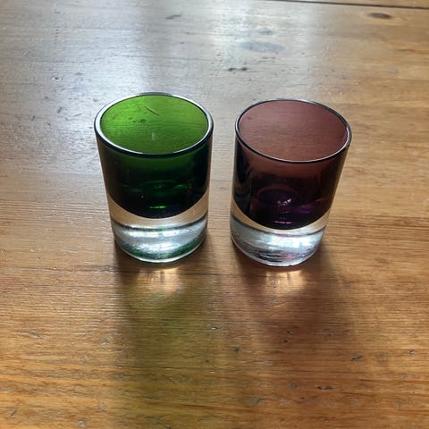 Kumelan ruskeat snapsilasit. Korkeus noin 5,5 cm ja halkaisija 4 cm.