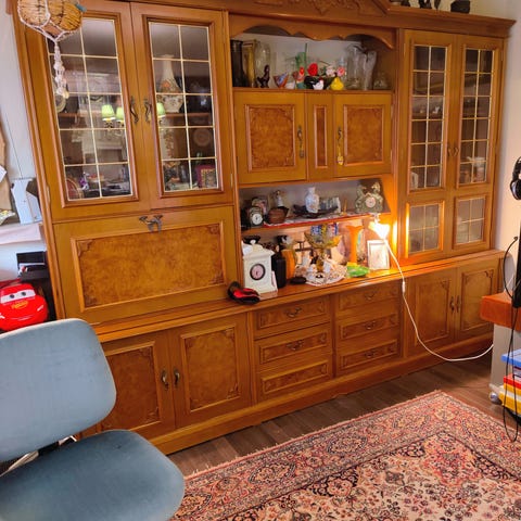 Vanha kirjahylly. Yksi kaappi lasiovella ja lasihyllyillä, tässä myös valot. Muut normihyllyjä. Neljässä osassa. Käytön jälkiä toki löytyy ja likainen.