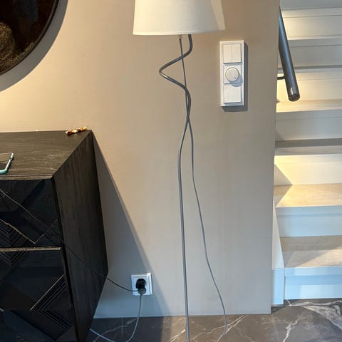 Kiva, kevyt ja näppärä lattiavalaisin. Valkoiset jalat ja valkoinen varjostin. 135cm korkea, varjostimen halkaisija 38cm.