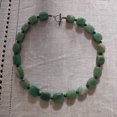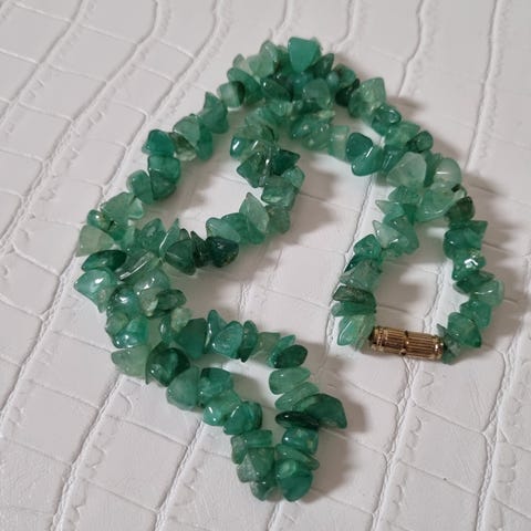 Hyväkuntoiset kivihelmet, mustat kivet, hopeanväriset metalliosat. Korun pituus on noin 44,5 cm. Helmien paksuus on noin 5 mm.
