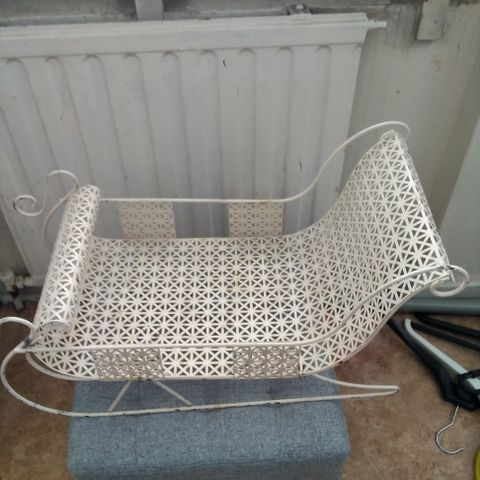 Koriste kelkka materiaali rautaa ja rottinkia,esim kukka-asetelmiin. Korkeus29 c, leveys 37c,korin syvyys n.10 c