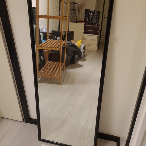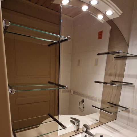 Finnmirror fasettihiottu peili ja valo pistorasialla peilin yläpuolella. Kokonaisleveys 600 mm ja korkeus kaaren yläreunaan 1050 mm. Peili kuvattu tason ja lavuaarin päältä. Valolle pitää olla erillinen valokatkaisija. Peili on irrotettu seinältä.