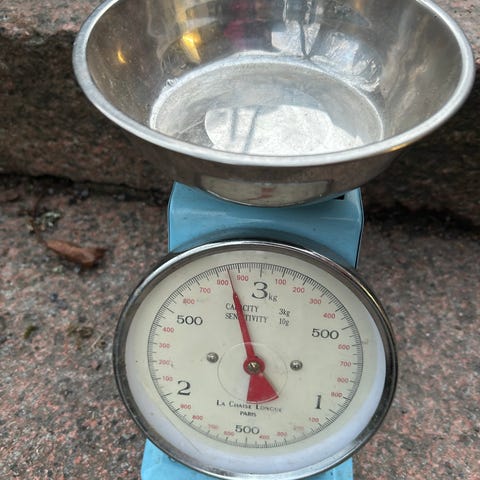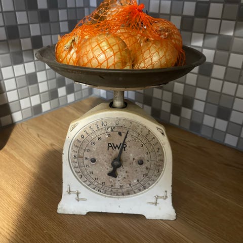 Vintage Westa keittiövaaka jossa ajanpatinaa on reippaammin kuten kuvista huomaa. En tiedä toimivuudesta