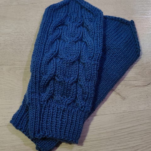Käsin tehdyt siniset palmikko neule lapaset. Koko noin 8.