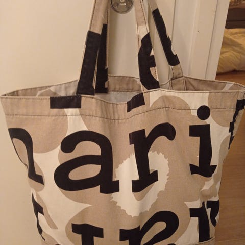 Hyvin pienellä käytöllä ollut hyväkuntoinen suuri Marimekon laukku. Materiaali paksua kangasta. Punaiset osat nahkaa.
